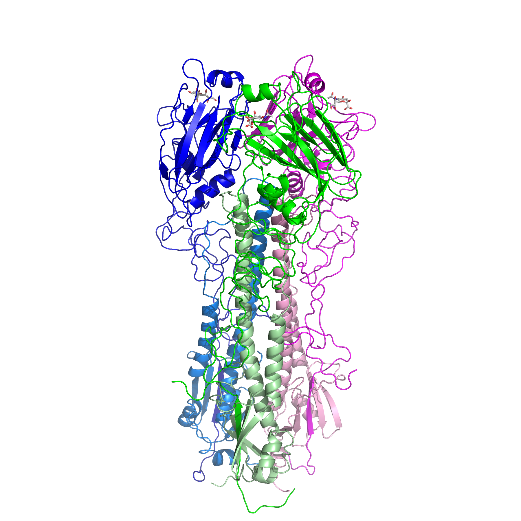 942 KB | Gillian Air | Structure of the H3 trimer. The image was made with PyMol (DeLano Scientific)using PDB file 5HMG. The three monmoers are colored green, blue and magenta.For each, the darker color is the HA1 polypeptide and the lighter shade is HA2. | 1 |