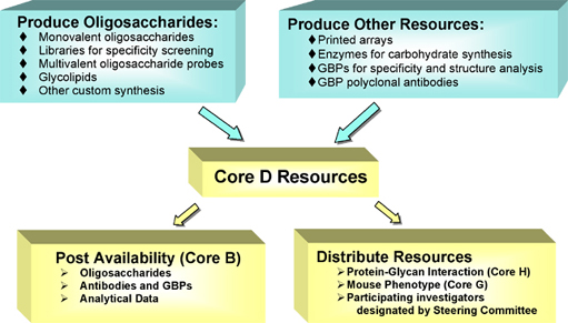 The Glycan Array Synthesis Core (D) produces a library of oligosaccharides for use by Participating Investigators