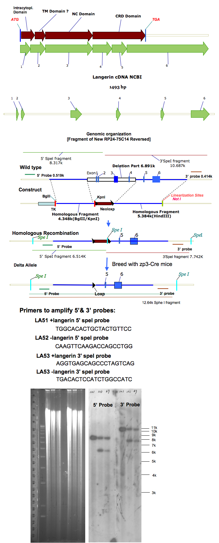 Langerin, a C-type lectin, plays a role in antigen processing and presentation. It is a potent inducer of Birbeck granule formation in Langerhans cells and is involved in nonconventional endocytic receptor routing into these organelles. Based on the genomic structure and the predicted functional domains, a non-conditional targeting strategy was designed where exons 1 to 4 are replaced by a floxed selectable marker.